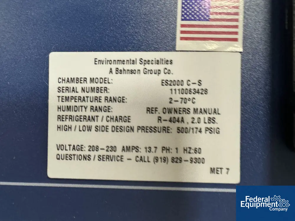 Used 33.8 cu ft Environmental Specialties environmental chamber, model ES2000 CS, 2-70 c temperature range, approximately 34" x 28.5" x 60" internal chamber dimensions, stainless steel internals, R404a refrigerant, touch screen controls and chart recorder, 208-230 volt, single phase, serial# 1110063428.
