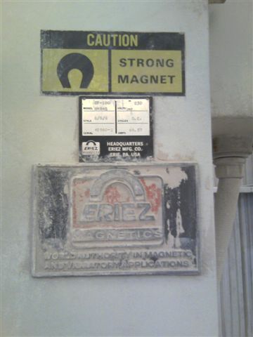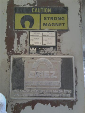 Used Eriez suspended self cleaning magnet, model# SC-1, SE7810, style# 1N-9924823, 106.6 amps; 115 volt, DC, with Eriez controller, model# N4-12.5K41, style# 201209773, 460 volt input VAC, 120 volt output VDC, 19 amp Input, 104.2 amp output, serial# 326869.