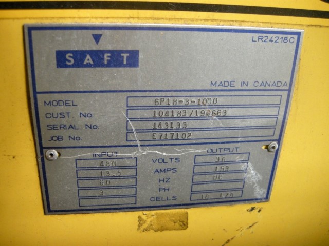 Exide System #ES3-18-850B03, Charger, (18) Cells, 3 Phase, 60 Hz, 850 AH, 13-29 Amps, 208-480 VAC, 36 VDC