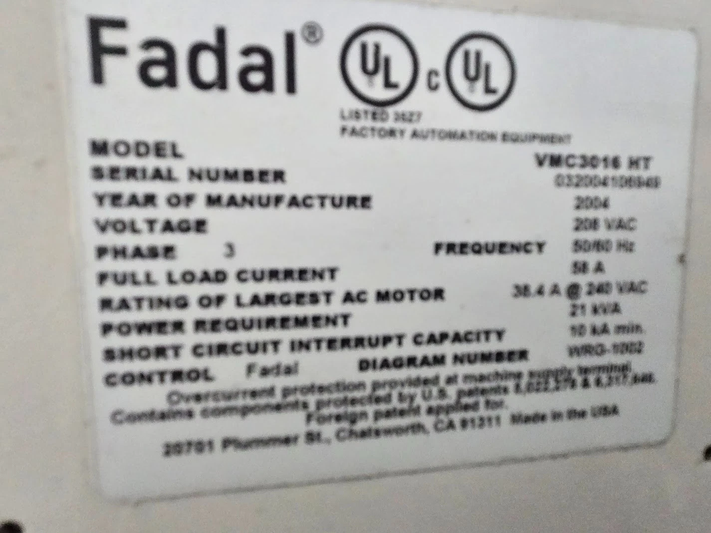 SERIAL. 9302025 NEW. 1993 MODEL. VMC 3016 (904-1) CONTROL. Fadal CNC 88 TABLE SIZE. 39" x 16" TRAVELS (X). 30" TRAVELS (Y). 16" TRAVELS (Z). 20" SPINDLE TAPER. CAT 40 SPINDLE SPEED. 10,000 RPM TOOLS. 20 TOOL ATC SPINDLE DRIVE. 15 HP.
