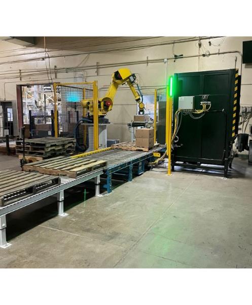 FANUC 410/160 PALLETIZING SYSTEMFanuc 410/160 Palletizing System with ControllerSpecifications: -- Finger Type Bag Gripper -- Pallet Dispenser -- Pallet Conveyor 10 Feet Powered and 16 feet Accumulation -- In Feed Pick Conveyor -- Loaded on your Truck