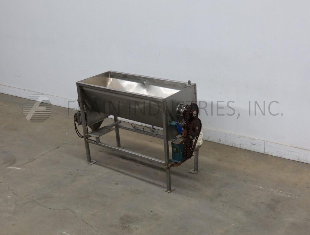 10 cu ft, S/S, pre feeder with product trough, and dual feed screws. Has 4 1/2" flanged end bottom discharge with a 14" floor clearance, and a Reliance Electric 3/4 Hp AC motor drive, and mounted on (4) leg base frame.