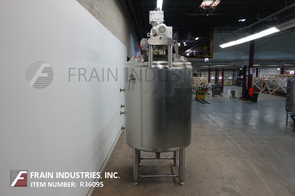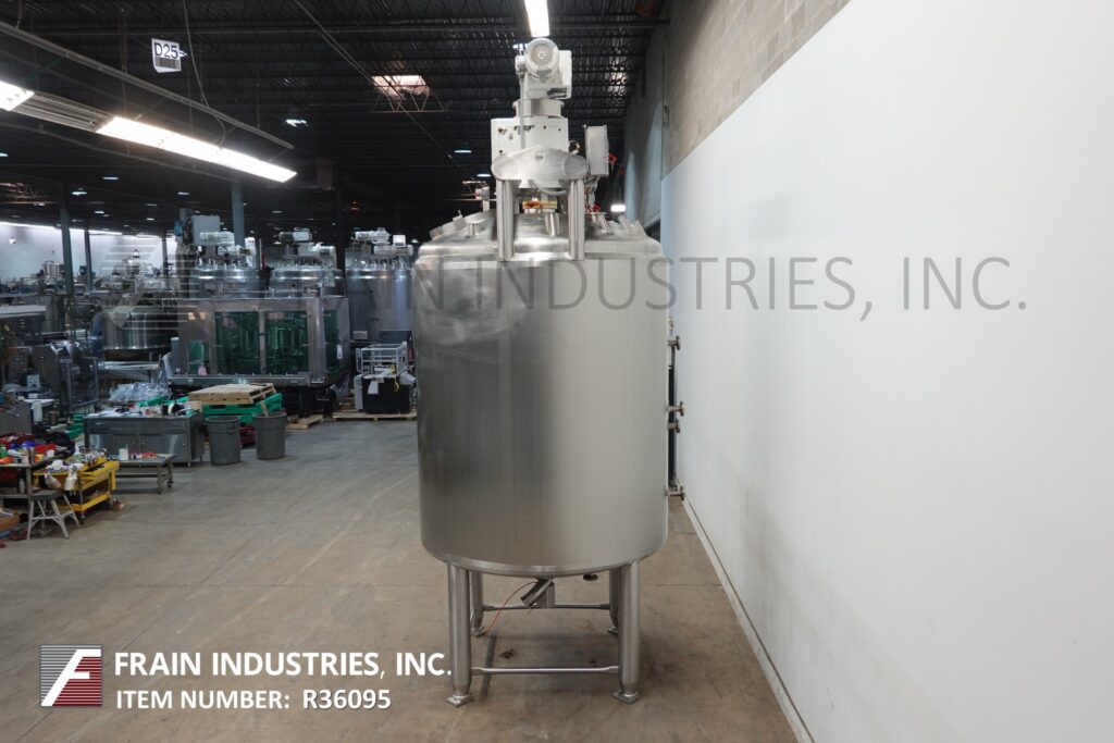 Lee, 1500 gallon capacity, 316 stainless steel jacketed and insulated process tank. Vessel dimensions: 78" diameter with 86" straight wall. dome top, 24" OD flip top man way and top mounted 15 Hp / 10 hp double motion scrape surface agitation. Dish bottom has 4½" OD / 4" ID center ...more