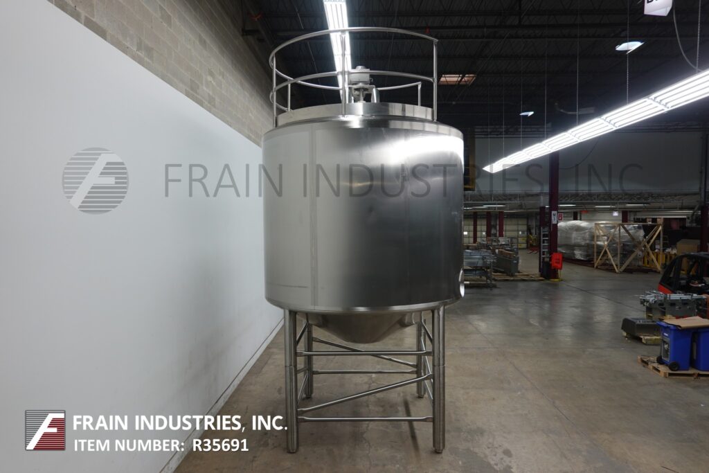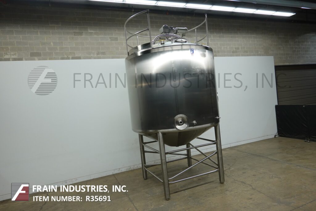 Feldmeier, 4500 gallon capacity, stainless steel jacketed and insulated process tank. 316L stainless steel contact parts and 304 stainless steel jacket and exteroir parts. Vessel dimensions: 114" diameter with 90" straight wall. Equipped with dome top, 18" OD flip top man way, top mounted 7½ Hp prop agitation, (2) CIP spray balls and (2) thermowells. Dish bottom has 4½" OD / 4" ID center bottom discharge with 48" ground clearence. Control panel with push button start / stop and variable speed control. Mounted on (4) legs with foot pads.