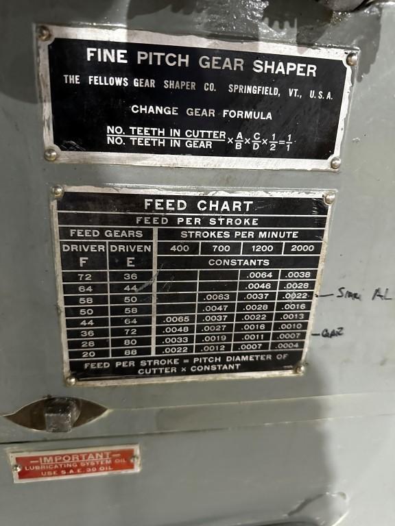 FELLOWS 61A Gear Shaper, used, from 1942 with an 18" size capacity. It has spur guides, a 5" riser, coolant pump, and change gears. Dimensions: 5'3" L x 4' W x 6'5" H, weighing 6800 lbs. Perfect for precise gear shaping needs., FELLOWS 61A GEAR SHAPER, S/N 24141 Year:1942, STANDARD, Max External Internal ...more
