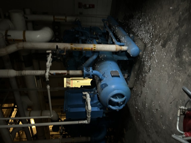 Complete industrial ammonia refrigeration compressor package mounted on a heavy-duty structural steel skid with all pressure vessels, controls, and safety systems intact. Ammonia refrigerant (R-717) system with full integrated skid assembly. Heavy-duty industrial construction ideal for cold storage facilities, food processing plants, ice rinks, industrial refrigeration systems, pharmaceutical manufacturing, or any large-scale industrial application requiring proven ammonia refrigeration technology with GEA / FES screw compressor reliability.