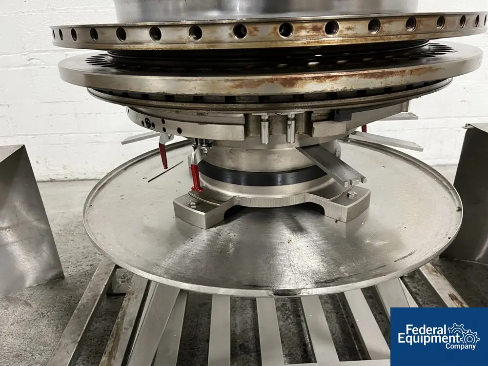 Tablet press, 36-station, manufactured by Courtoy, type R100/36, rotary, stainless steel contact parts. Has provision for (36) 24mm diameter x 22.22mm high dies with (36) 19mm diameter x 133.6mm long punches. Maximum 80kn compression force with 5kn precompression force. Will accomodate bb punch with maximum 13mm ...more