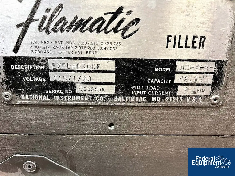 Used Filamatic filler, model DAB-Z-5-4, 4 pump design less pistons, 115 volt, serial# C005566.