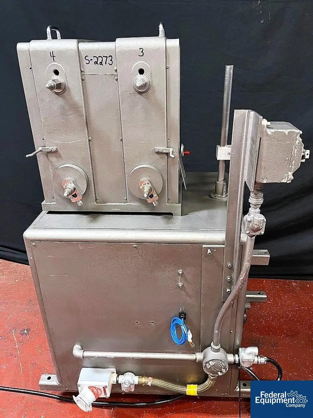 Piston filler, Filamatic model CVKM-300-1 with 4 pistons, each with 1000 cc or 1 liter capacity. Unit is stainless steel contact parts, complete with conveyor, mild steel frame. Filler is in good condition, last run on copy machine toner, would need to be cleaned well for food use. Includes conveyor controls and drip ...more