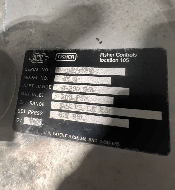 Fisher Controls Tank Blanketing Valve Model ACE95JR. Serial# 18571778. Inlet Range 0-200 PSI. Max Inlet 200 PSI. Set Range 0.5 to 1.5 PSI. Set Press 0.5 PSI. Cv 0.2
