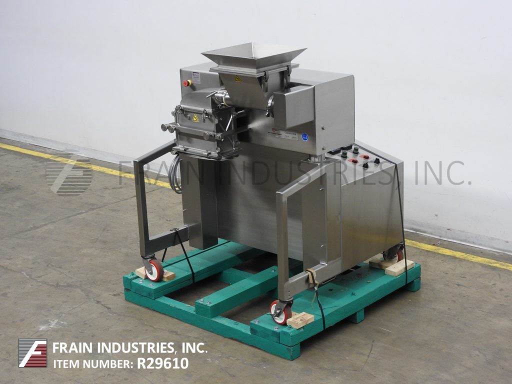 Fitzmill, Model D6A, compact, enclosed GMP sanitary design, 316 stainless steel construction, pharmacutical hammer mill. Equipped with 12" long x 12" wide x 10" deep stainless steel product feed hopper with safety grid and 16" long x 3" OD stainless steel vari speed metering feed auger, enclosed process chamber with (16) fixed stainless steel knife / blount blades. and 13” long x 6” wide product discharge with 36” floor clearance. Control panel has speed adjust dials and start, stop buttons for mill and feed screw with feed screw rpm and machine amp readouts with e-stops. Mounted on locking casters. Rates / Volumes dependant on materials, application and machine configuration.