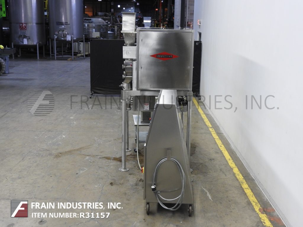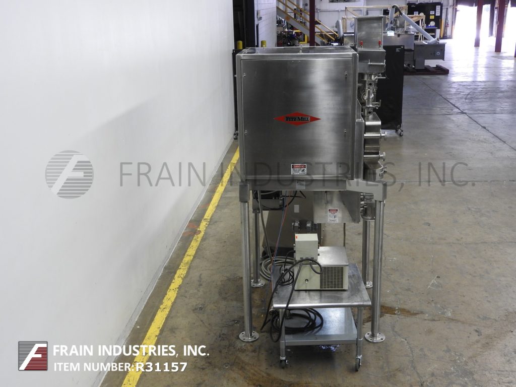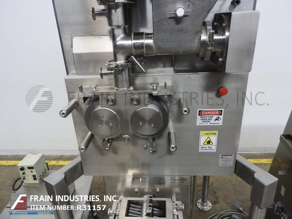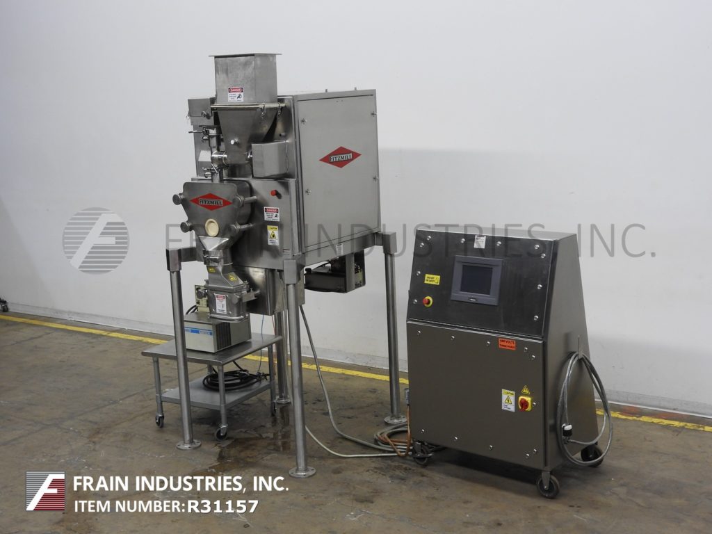 Fitzpatrick Model IR520, 316 stainless steel, roller compactor, chilsonator with onboard stainless steel Fitzmill Model M5A hammer mill rated up to 220 lbs of product per hour – depending on materials, application, machine configuration and environment. Equipped with (2) screw feed design and has 13" long x 8" wide x 12" deep ID stainless steel product hopper with rotary product feeder, 3" OD horizontal screw that eliminates vacuum dearation to 2" vertical pre-compression screw that compresses product for more uniformity prior to feeding into the 2" x 8" groved product compaction rollers with roller force of 26.3 KN/CM and roller gaps of 1mm to 6mm, powered by 5 Hp motor drive with onboard stainless steel Fitzmill Model M5A hammer mill with (16) fixed stainless steel blades and 6" OD product discharge with 49” floor clearance. Remote control panel has A/B PLC with Parker panelview touch pad controller and Brookfield TC-500 refrigerated circulating bath both with casters. Chilsonator mounted on (4) stainless steel legs.