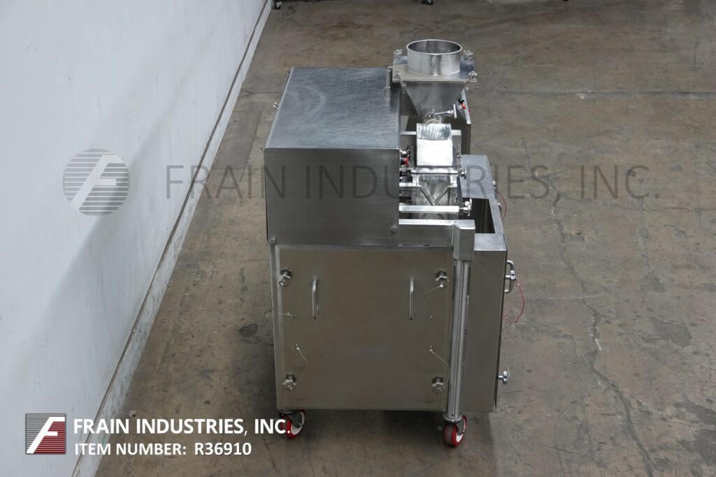 Fitzmill, Model D6A, Compact, enclosed GMP sanitary design, 316 stainless steel construction, pharmacutical hammer mill, pounds of product per hour – depending on materials and application. Equipped with 15" long x 15" wide x 9½" deep stainless steel product feed hopper with 10¼" diameter charge port, safety grid, stainless steel vari speed metering 3" diameter feed auger, enclosed process chamber with (16) fixed stainless steel knife / impact blades and 13” long x 5” wide product discharge with 36” floor clearance. Remote control panel has speed adjust dials and start, stop buttons for mill and feed screw with feed screw rpm and machine amp readouts with e-stops. Mounted on frames with locking casters.