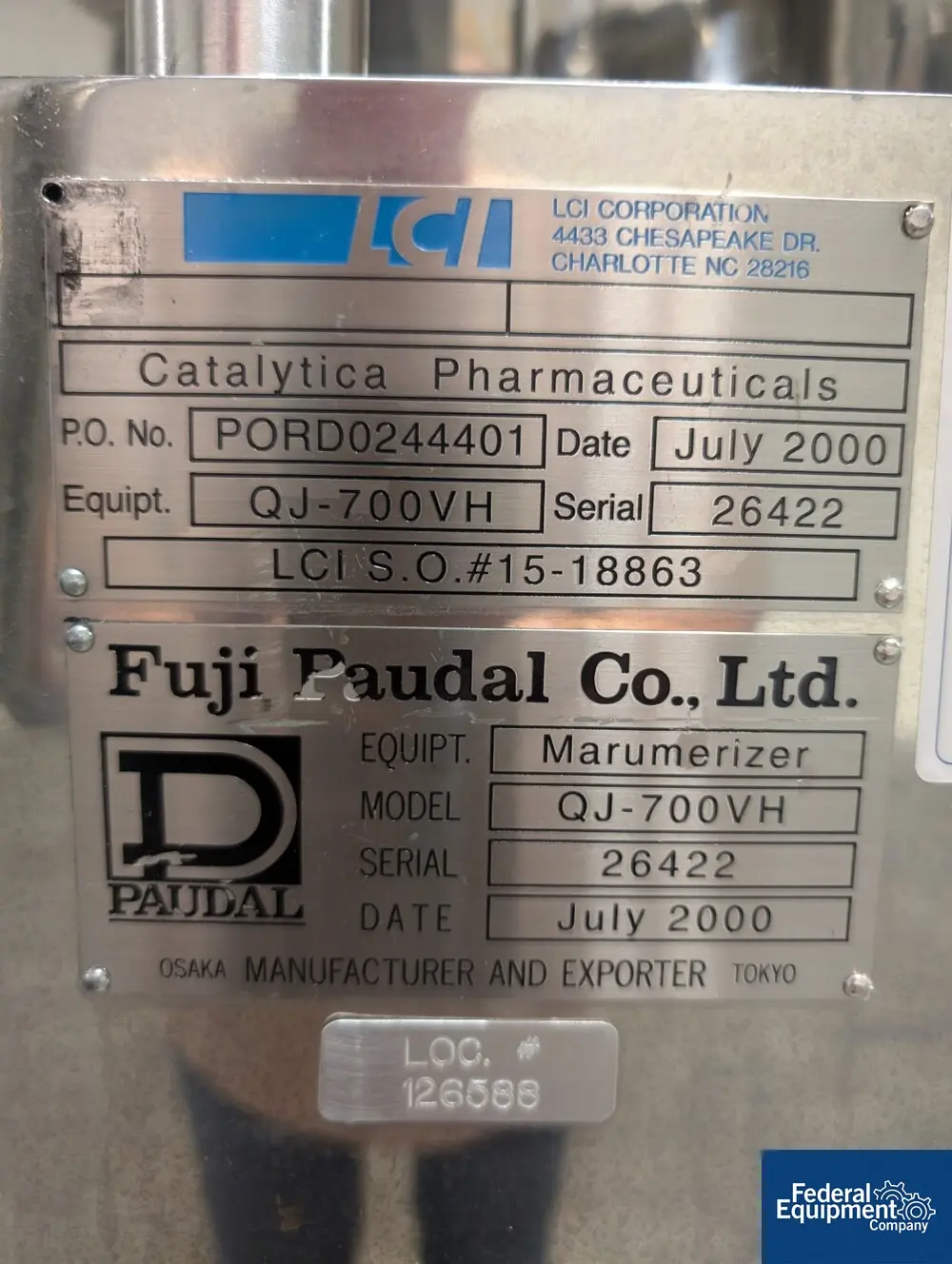 Used LCI Fuji Paudal Marumerizer, model QJ-700VH, stainless steel, jacketed chamber, side discharge with plug valve, 3.7 kw motor, external control panel, serial# 26422, built 2000.