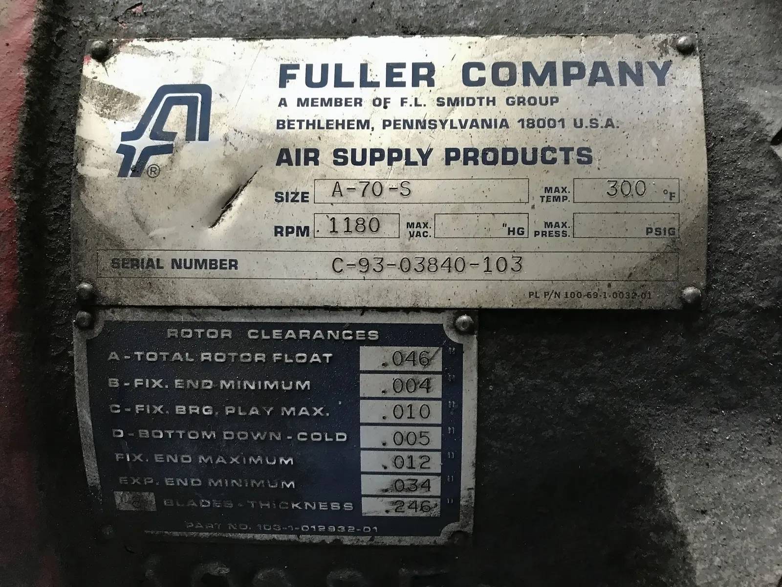 Fuller Company (F.L. Smidth Group) Rotary Vane Compressor. Size: A-70-S. RPM: 1180. Serial: C-93-03840-103. Previously used with ammonia refrigerant.