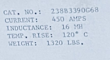 450 Amp. General Electric DC Link Reactor Cat # 238B3390G68, Current 450 amps, Inductance 16 MH for EX2100 exciter Manufacturer: General Electric Amp.: 450 Stock # R11 Request a Quote 3 View PDFFor Sale by NSV Energy, LLC Surplus Record Dealer Since 2013 Contact Seller Canton, GA Sales 908-42...> Show Seller's Phone Number 908-421-4139 Let the seller know you found their listing on Surplus Record! View More NSV Energy, LLC 's ListingsDescriptionStock # R11One (1) GE DC Link Reactor Cat # 238B3390G68, Current 450 amps, Inductance 16 MH, Temperature rise 120 Deg C, Enclosure NEMA 3 RShipping Dimension: 85” L x 85” W x 106” H 2870 lbs Request More Information from SellerGet Your Price from NSV Energy, LLC! "*" indicates required fieldsName*Company*Email* PhoneZip / Postal Code*QuestionMake an OfferRequests Send me a shipping quote I am interested in financingSend Copy Email me a confirmation of this inquiryBuyer Protection Use our partner Escrow.com to buy or sell equipment safelyBuyer Protection Send me info about buyer protectionThis field is hidden when viewing the formDealer Email Buyers Who Viewed This Listing Also Viewed … 200 Amp. Telema & Berger, neutral grounding resistor, PN NG24-210-CT (2 available)Category: ResistorsSeller: Mid-America Engine IncLocation: Warrior, AL Mfr: Telema & BergerPRICE: $5,000 CATEGORY: Parts/Accessories MODEL: Telema & Berger NGR CONDITION: Used ITEM ID: 1222 Neutral Grounding Resistor P/N NG24-210-CT (2) available Price is per each, Additional Info, MAE #: 10368-10369. 1000 Amp. General Electric, Neutral Ground Resistor, 2.40 Ohms, 2400 Volts, 10 Sec. Duty, NEWCategory: ResistorsSeller: Universal Industrial AssetsLocation: Gonzales, LA Mfr: General Electric 100 Amp. Guyan Machinery #GR-15638-04, neutral groud resistor (NGR), 8000 VoltsCategory: ResistorsSeller: Lenmark IndustriesLocation: Langley, BC Mfr: Guyan MachinerySKU: 141469, Model: GR-15638-04, Condition: Used, S/N: 900910, Amps: 100 amps, Time Rating: 10 sec., Resistance Value: 80 OHMS, System Voltage Rating (Line-to-Line): 8000, Made In: UNITED STATES, Dimensions: 66.50 (H) x 58.00 (W) x 46.00 (L) inches, Additional.JUST ADDED! Bonitron #M3775RK-H600A-3R, Dynamic Braking Resistor, 1.25 OHMS, 64,000 watt, NEMA 3R, 460 VACCategory: ResistorsSeller: Garland Bros IncLocation: Suwanee, GA Mfr: BonitronPLEASE REVIEW: We would ask that potential buyers please view the photographs carefully, and understand what you are buying. All questions should be submitted prior to your purchase. *Your purchase includes a 30 day warranty, so you can buy with confidence.* We cannot negotiate price or terms after the sale. Payment ...more 10 Amp. Powerohms, 347 OHMS, Grounding ResistorCategory: ResistorsSeller: Collicutt Energy ServicesLocation: Red Deer, AB Mfr: PowerohmsShare × "*" indicates required fieldsYour Name*Your Email* Recipient's Email* Note to Recipient