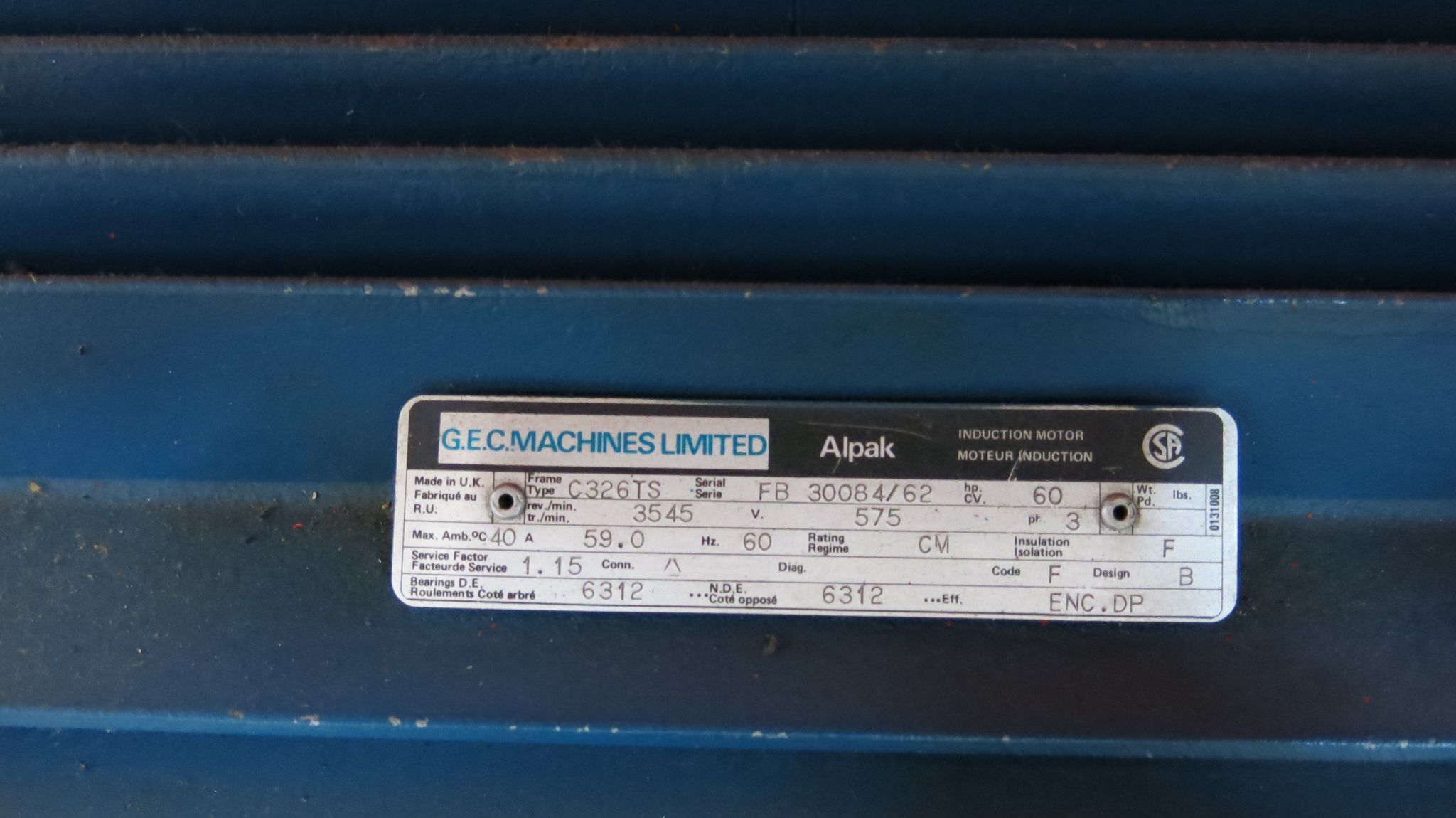 GEC MACHINES LTD, 60 HP, INDUCTION MOTOR MOUNTED ON FRAME, TYPE C326TS, S/N FB30084/62