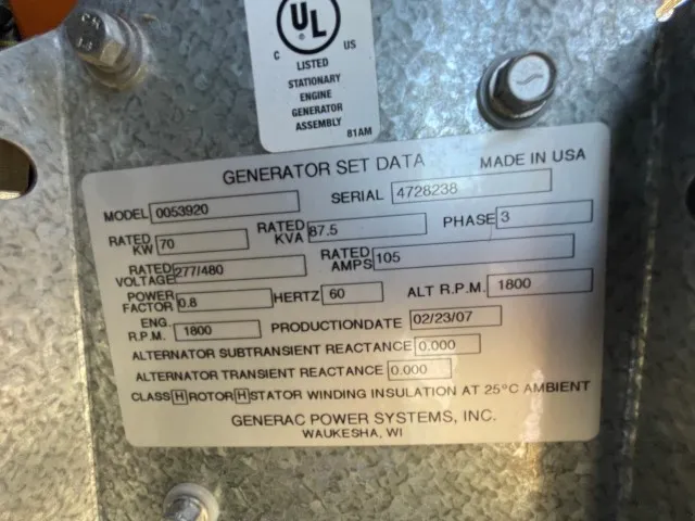 70 KW Generac #2970030100, Natural Gas Generator, 120/240 Volts, 1800 RPM, 3 phase, 107 HP, 88 kVA, 16 hours, 2003