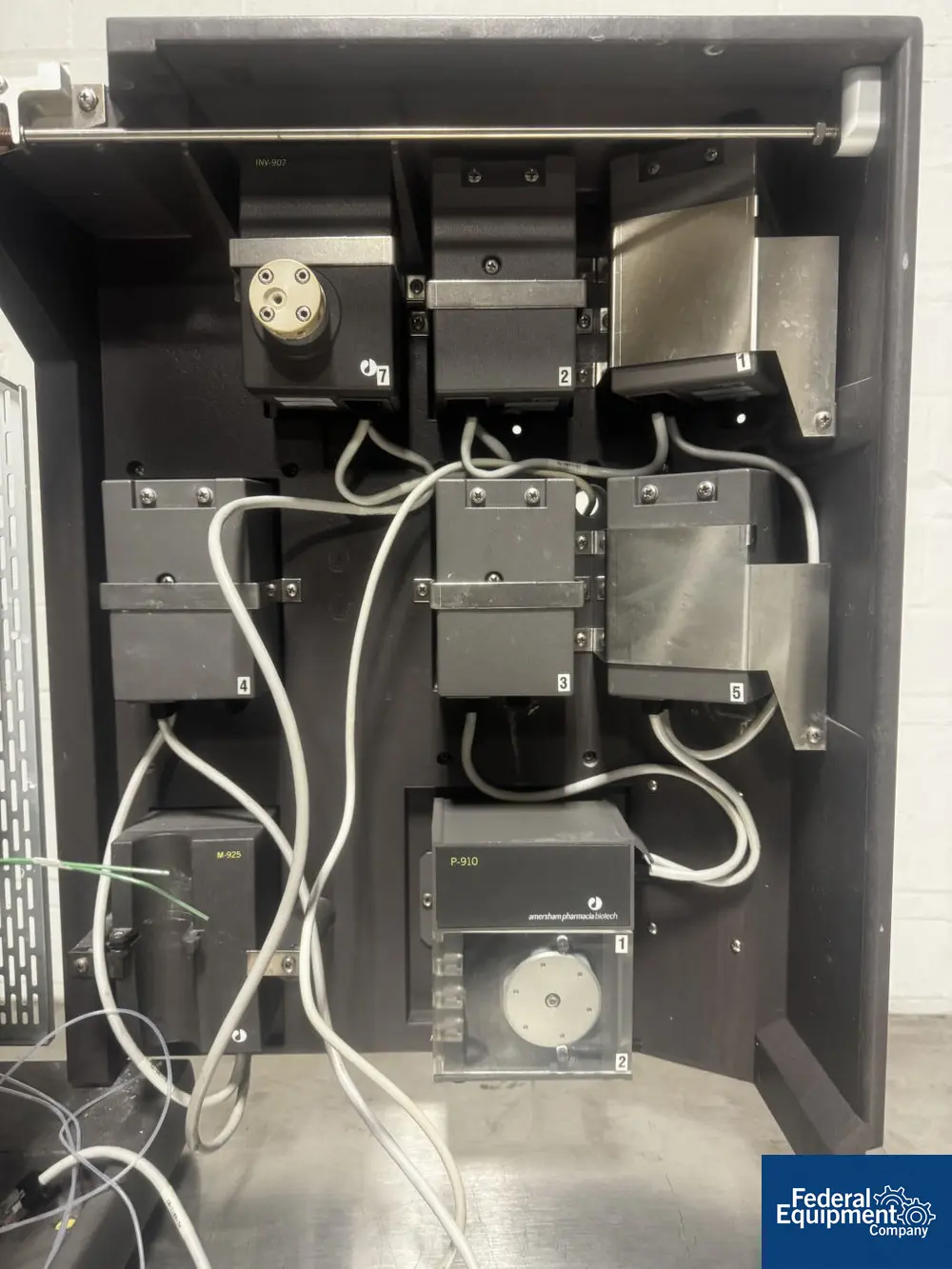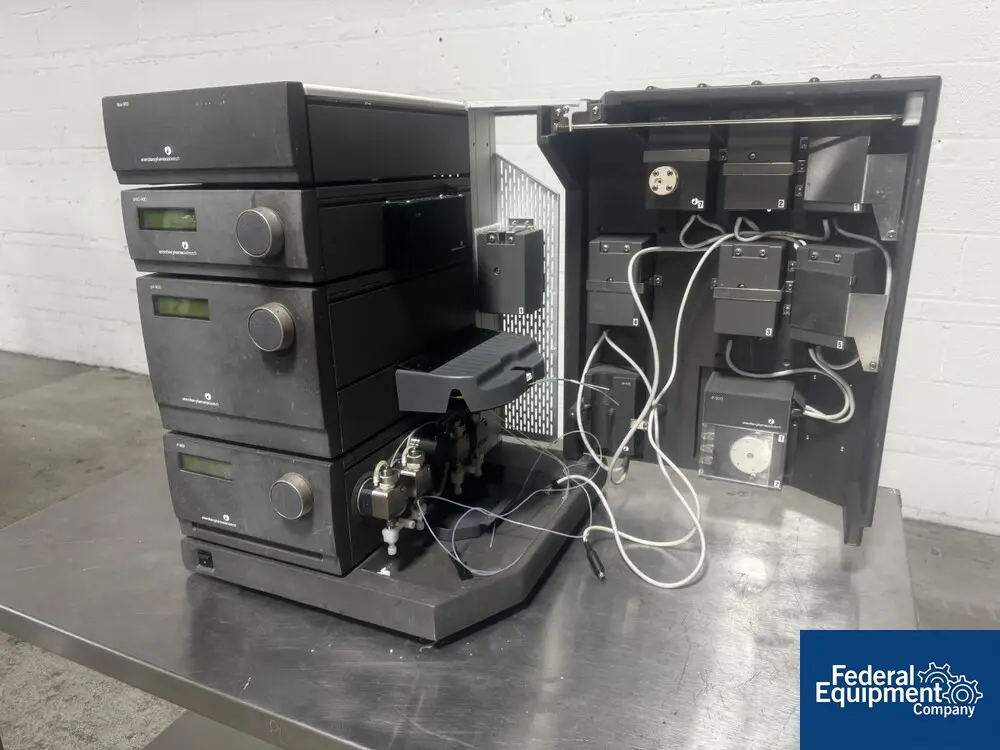 Used GE AKTA Explorer HPLC, model 100, consisting of pH/C-900 pH & Conductivity tester, UV-900 spectrometer, P-900 pump module, Box-900 control module, 120 volts.