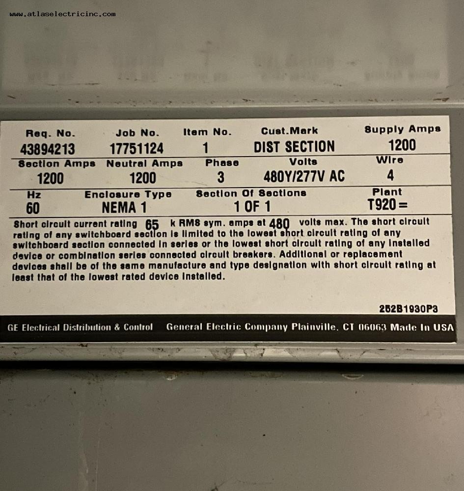 1200 Amps, General Electric, switchboard, Pringle switch, 125 V.DC, 480 Volts