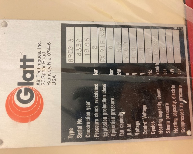 Used Glatt Model GPCG-5 Fluid bed Dryer. Wurster, 2 Bar, 5.5 KW, 3/60/460 Volt, 3600 RPM. 16,800 KCAL/Hr, 3 Bar Steam Pressure. 6 Bar Compressed Air. S/N: 3977, Built 1983.