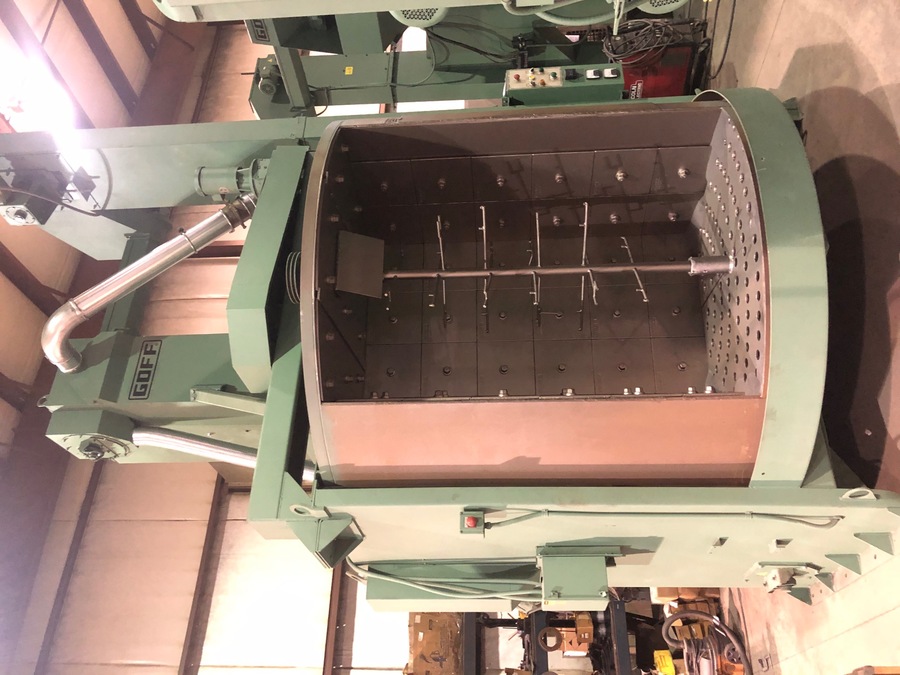 This is a gently used Goff 2460, featuring two 15 HP direct drive blast wheels, indexing chambers, CFS foundry duty seperator, and reclaim system., Manufacturer Goff Model 2460S Year 1992 Condition Good Stock Number SH 5006 # of wheels 2 Hp per wheel 15 Capacity 24" Diameter x 48" High Dust collector No.