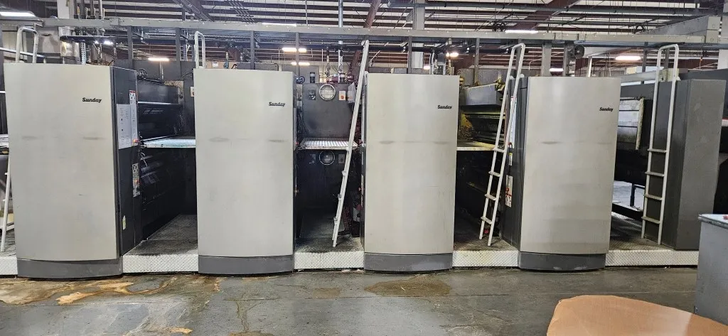 Used Goss Sunday 2000 heatset web presses available in several configurations for commercial printing, direct mail, retail inserts, and premium heatset production. These presses are known for wide-web capability, high print quality, and strong output speed up to 80,000 iph. Web widths include 35", 38", 54", and 57" with multiple cutoff sizes depending on configuration.