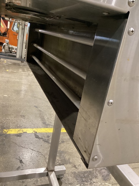 NAFM, Model YS-130L, stainless steel steam shrink tunnel. Capable of handling round, square, oval and other irregularly shaped containers. a 5" wide x 12" high x 80" long tunnel, with (12) sets of adjustable steam nozzles, (6) flow controls, 1" NPT connections for steam supply and mounted on a ...more