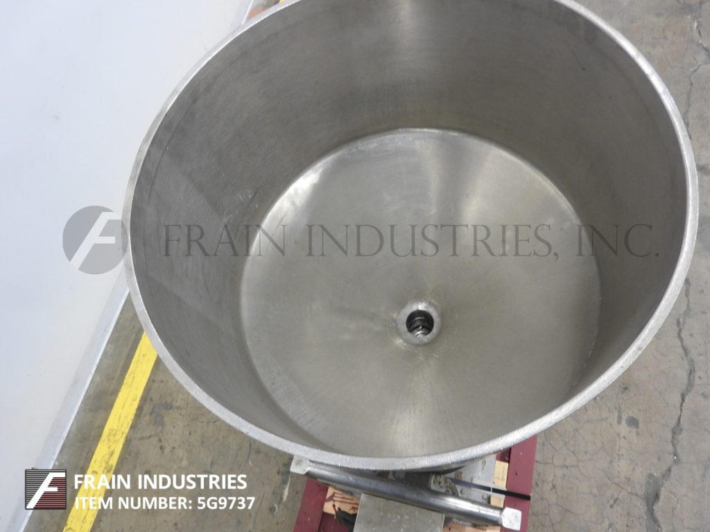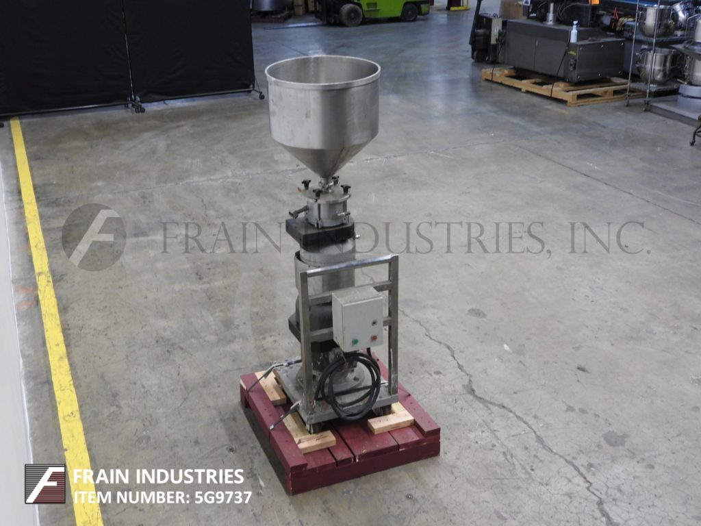 Greeco, Model W500V, colloid mill. Capable of complete dispersion and deagglomeration of liquids in liquids or solids in liquids at rates from 100 to 300 gallons per hour – depending on materials, application and machine configuration. Equipped with 20" diameter x 20" deep (20 gallon capacity) stainless steel hopper and 1" diamter discharge with 44" ground clearance. Rotor powered by a 10 hp drive and mounted on a push cart base.
