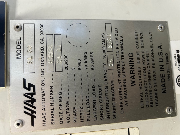 Haas SL30 CNC Chucker Lathe, (subject to buyer verification):, 30″ swing over bed ways, 14.5″ swing over cross slide, 17″ max turning diameter, 3,400 RPM spindle speed, 3.5″ spindle bore, 3.03″ bar capacity, A2-6 spingle nose, 30 HP main electric motor, 12 turret positions, 11.3″ ...more