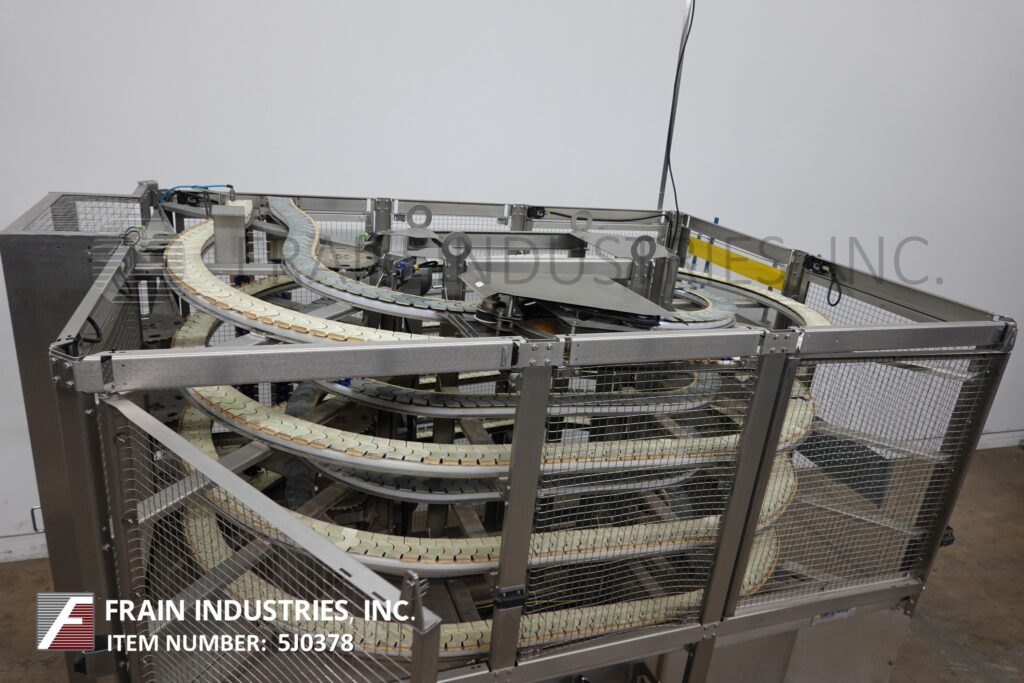 Hartness, Model 6400, DYNAC pressureless accumulation conveyor with number of containers per hour – depending on materials and application. Equipped with 4" wide table top conveyors with 42" infeed and discharge height Conveyor contains about 100′ of accumulation and 9" height clearance. Control panel has AB controller with touch screen HMI. Mounted on heavy duty frame with safety guarding.