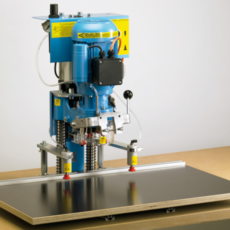 RAFIX - Futura 250: Hinge Boring & Inserting Machine with 1-1/2 HP Motor -- High-quality air cylinder (80 mm bore with 650 ft. Lbs of pressure @ 90 PSI) rated for 3-1/2 million 3" strokes.A skilled Operator can bore & insert in (3 - 4) seconds. -- s: (2) Types of boring depth adjustment: Drawbar style for ...more