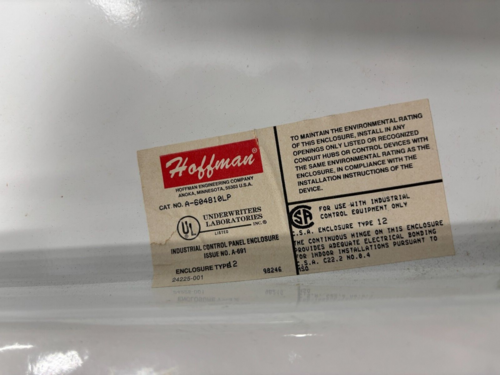 The Hoffman 604810LP is a robust, double-door floor-standing enclosure designed to house electrical and pneumatic controls, instruments, and components. It features a durable steel construction with a white interior and a gray exterior finish. The enclosure is NEMA 12 rated, providing protection from dust, dirt, oil, and water.
