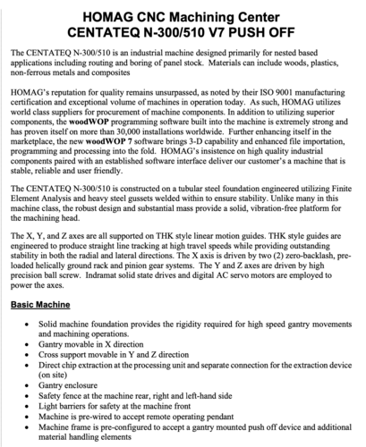 Product : Homag Centateq N-300 510 V7 CNC Machining Center - Router (2024) - Michigan, Machine Location State: Michigan, Machine Location City: Grand Rapids, Year: 2024, Make: Homag, Model: Centateq N-300 510 v7, Serial No: 0-250-89-2334, Phase/Voltage: 3 phase, Condition: Excellent, Any Known Issues: None, In ...more