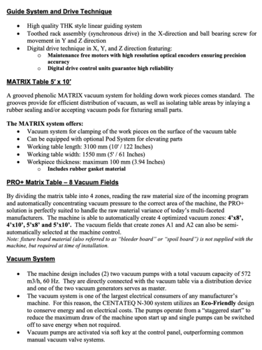 Feed Rate: X Axis ~ 60 m/min Y Axis ~ 60 m/min Z Axis ~ 20 m/min One 12 Hp ANDI HSK-63F air cooled spindle, 24,000 RPM 5 x 5 vertical drilling SYNTEC CNC Controller with independent cabinet and remote hand wheel One 10 Hp Becker vacuum pump Touch off function fixed on the table Helical rack direct drive ~ not belt ...more