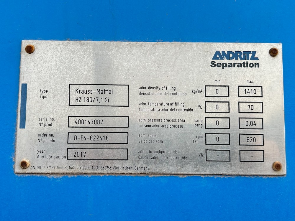 (NUEVO) Centrifuga Pelador KRAUSS MAFFEI ANDRITZ Horizontal, en Acero Inoxidable, Modelo HZ180/7.1, Serie: 400143087, Año 2017, Velocidad de la canasta 820 rpm, Tamaño de cansta 1800 mm de diametro X 1250 mm de largo. Fuerza centrifuga 675 g a velocidad máxima. 7.1 m2 superficie de filtración. Icluye paneles de control. Faltantes: Motor, Modulo de lubricación, instrumentación y la bomba hidráulica. Favor de Inspeccionar.