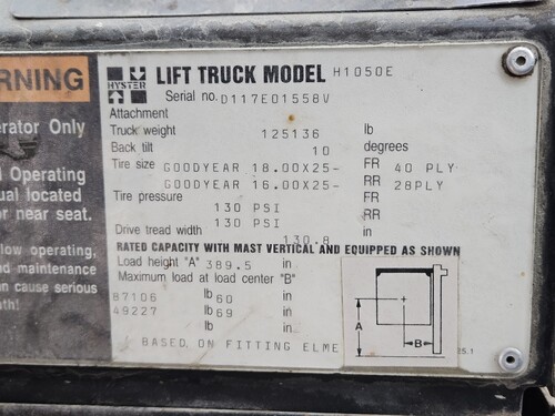 Lift Capacity: 87,106 LBS, at 60” load center, contact Hyster to confirm and additional information