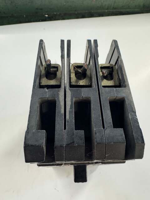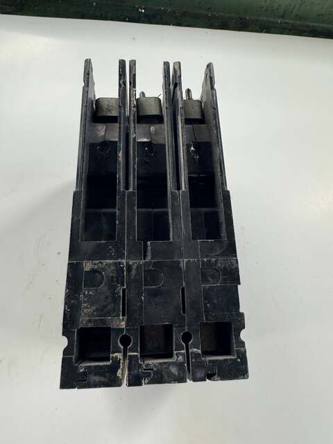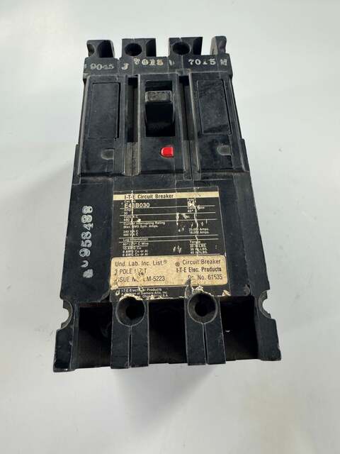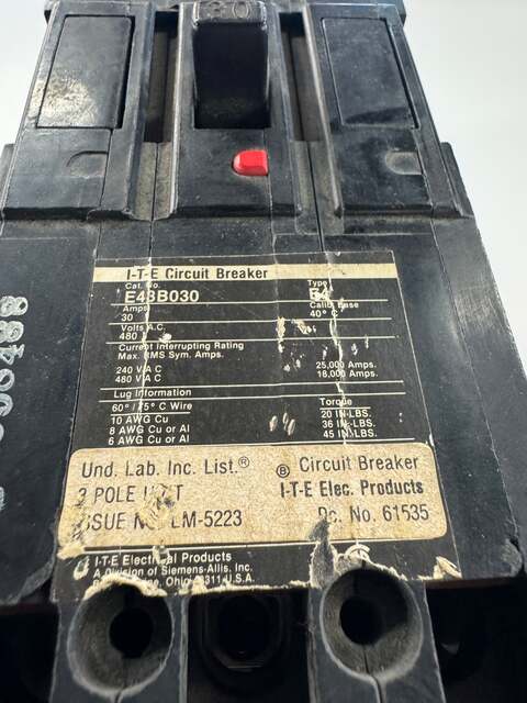 The I-T-E E43B030 is a molded case circuit breaker rated at 30 amps and 480 volts AC, configured as a 3-pole unit. Manufactured by I-T-E Electrical Products, a division of Siemens-Allis, Inc., this breaker carries catalog number E43B030 and is classified as Type E4. The current interrupting rating is 18,000 amps RMS symmetrical at 480V AC and 25,000 amps RMS symmetrical at 240V AC. The calibration base is 40 degrees C. Lug information as shown on the nameplate covers 60/75 degree C wire, with wire range accommodating 10 AWG copper, 8 AWG copper or aluminum, and 6 AWG copper or aluminum. Corresponding torque values are 20, 36, and 45 in-lbs respectively. The nameplate references UL listing under Issue No. LM-5223 and Doc. No. 61535. Serial number visible on the unit is 9958488. This is a bolt-on style breaker with a standard 3-pole configuration suited for industrial panel applications operating at 480V three-phase systems. The unit retains its original nameplate with all specification data legible.