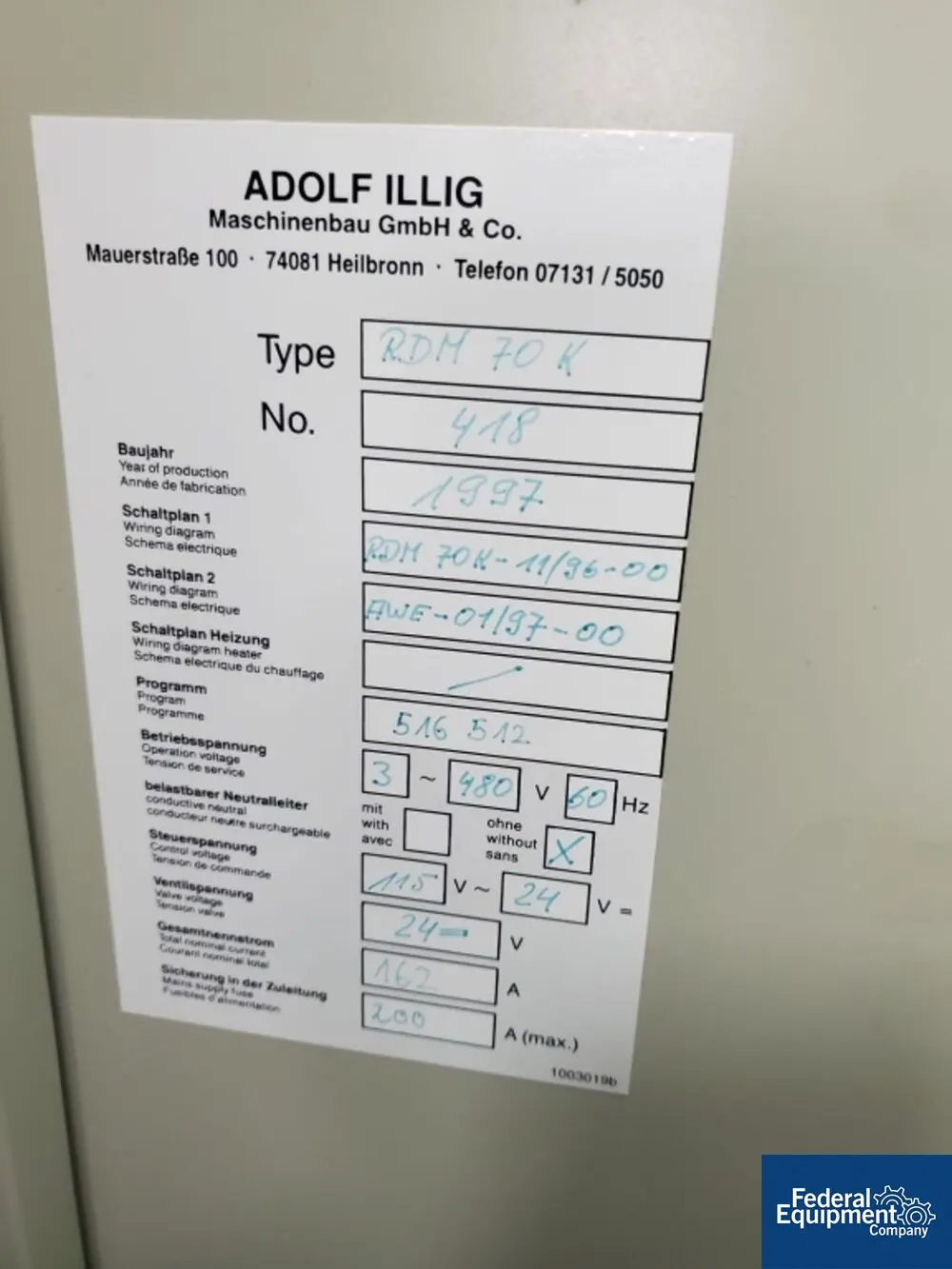 Used Adolph Illig roll thermoforming line consisting of, Illig roll feeder, Illig pre-heater, model VHW 72, 30 kw heater, 480 volt, serial# 451, built 1997, Dr. Honle UV unit, Illig thermoformer, model RDM 70K, serial# 418, built 1997, Illig integrated scrap grinder, model RS 75B, Siemens controls.