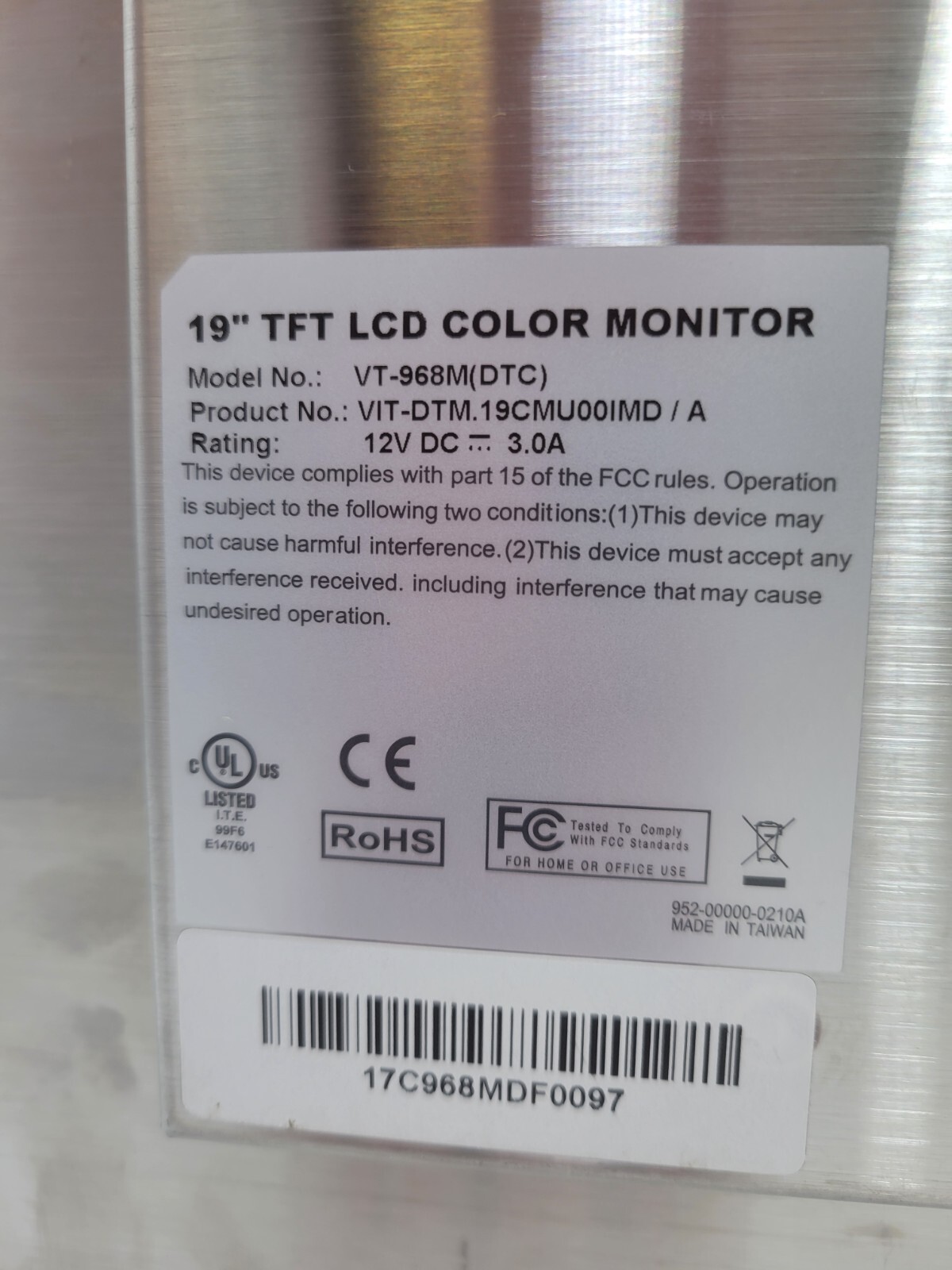 IMD Vista VT-968M(DTC) VIT-DTM.19CMU00IMD / A LCD Color Monitor 19" Touchscreen 12V 3A.