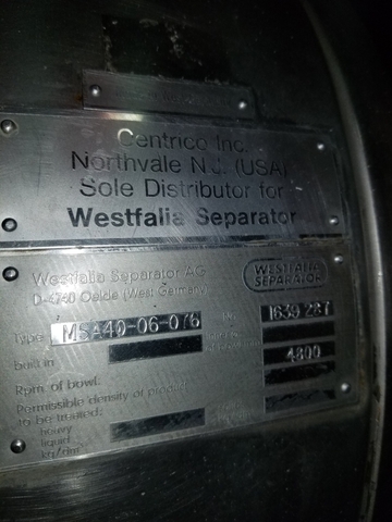 ITEM NO : 101029 QTY : 1 ALLOY : S TYPE : DISC MATERIAL : POLISHED 316SS MANUFACTURER : WESTFALIA MODEL : MSA100-01-076 DRIVER TYPE : MOTOR RPM : 4500 BOWL TYPE : DISC CENTRIFUGE-A; WESTFALIA MODEL MSA100-01-076; POLISHED 316SSSEPARATOR SELF CLENAING DISC BOWL CENTRIFUGE; REBUILT BY CENTRICO IN 1995; MODEL MSA 100 ...more