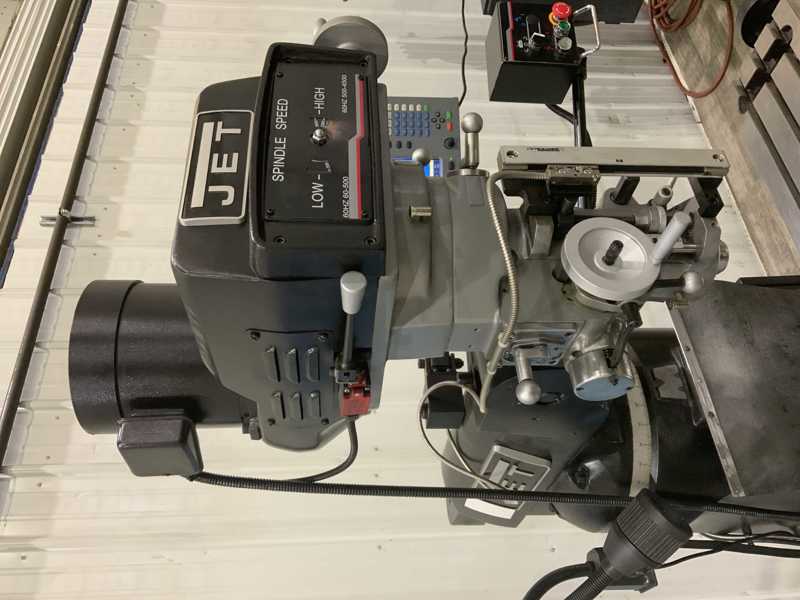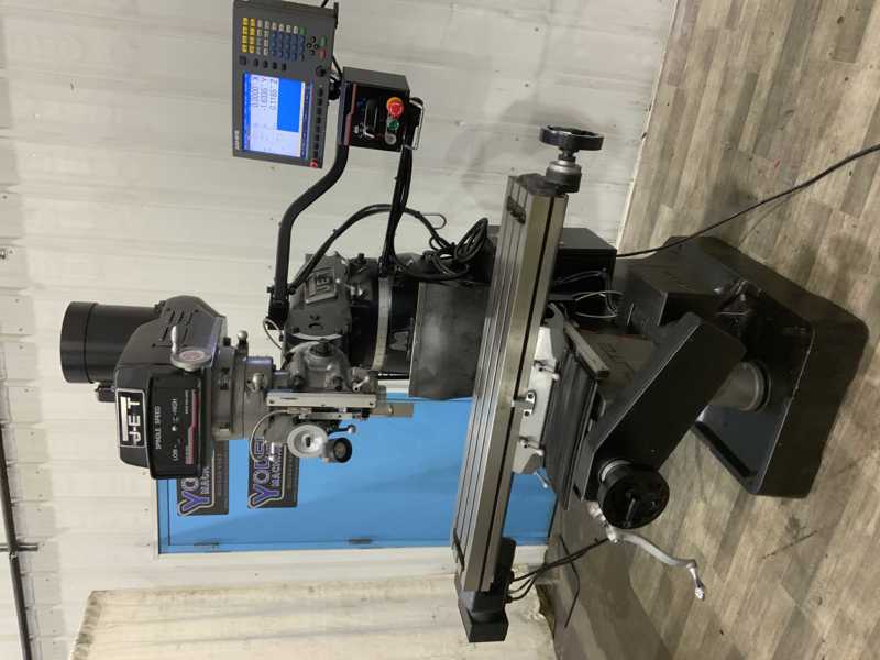 Sharp #LMV/MP2, vertical mill, 9" x42"tbl., 3 HP, 25" X, 11" Y, 5" Z, 60-4500 RPM, R-8, AcuRite Millpwr MP2, Kurt power draw bar