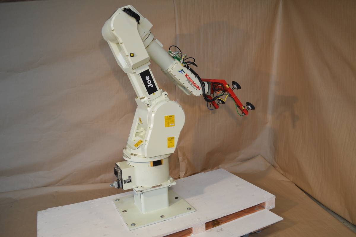 KAWASAKI FS030L E Palletizing RobotArticulating arm type Palletizing Robot.: -- Suction cup type "pickup". -- PENDANT 6 AXIS -- Controller Model "D32FD001" -- Capacity: 30 kG (66 Lbs) bags. -- Complete with pendant control station. -- Includes control panel Cabinet. -- Dimension; 98" H x 42" W x 98" L (wooden crate); ...more