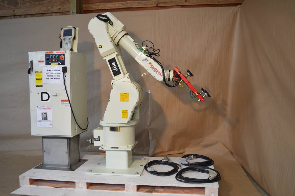 KAWASAKI FS 030L E with "D+" (D Plus) controller, Manufactured date 2008, 6 axis, 30 KG 66 pounds capacity, teach pendant, 3 wire cords, video of them operating before removal in 2/2015, Robot - Prior owner discontinued a manufacturing process, so these robots were no longer needed by prior owner. These robots are stored inside, and were only transported by a curtain van semi trailer to ensure protection from the weather! Several robots available. Includes robot, controller, pendant, 3 cords and HD pallet. Each robot will be packaged on a heavy duty pallet with a plywood crate on top of pallet to reduce the risk of shipping damage. TR803