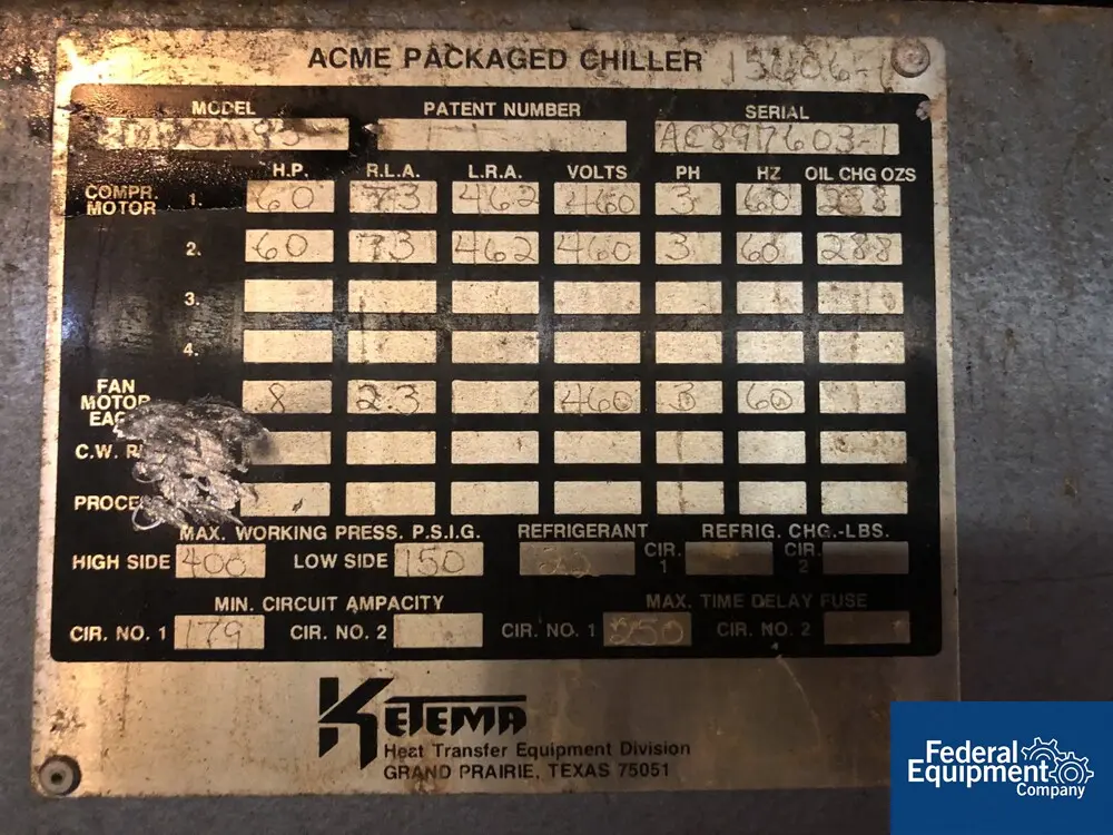 Used Ketema chiller, model DDCA95, water-cooled, with (2) 60 hp compressors, r22, 460 volt, serial# AC897603.