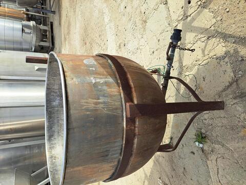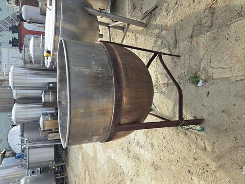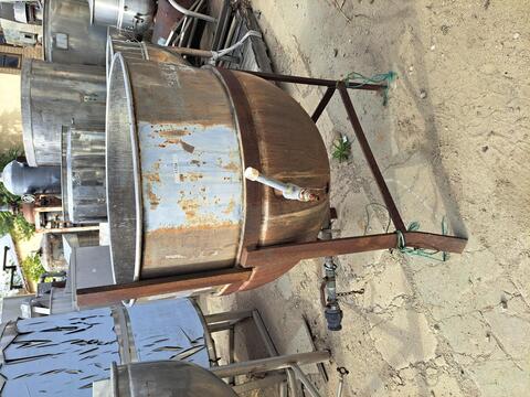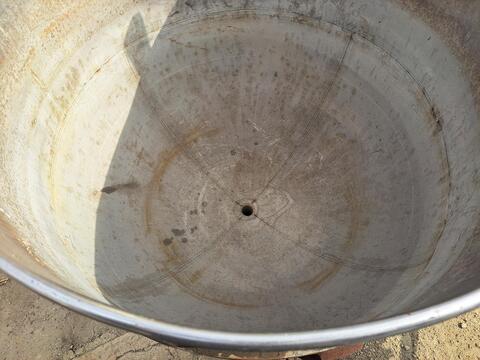Groen 80 Gallon Stainless Steel Jacketed open top dish bottom, Dimensions approx. 32 inches diameter x 29 inches deep. Jacket rated 40 PSI ,serial number #10666. With approx. 1 1/2 in. diameter center bottom outlet with 90 degree elbow stand on three legs carbon steel frame.