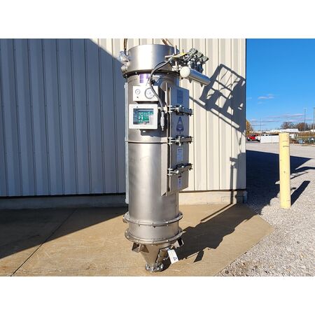 ITEM 2348: 40 Square Feet Horizon Carbon steel dust collector pulse jet cleaning., is designed to have bags 36 inches in length., Collector is approximately 30 inch in diameter by 96 inches overall height., Side door construction for side bag removal., Upper clean air outlet is 8” diameter flanged., Material ...more