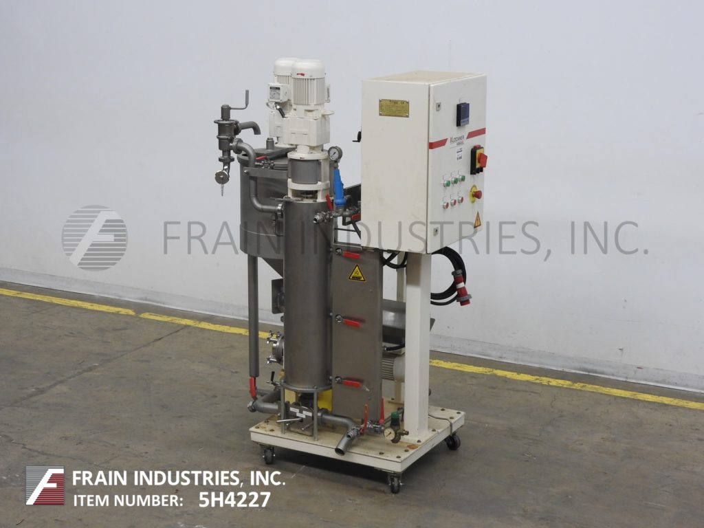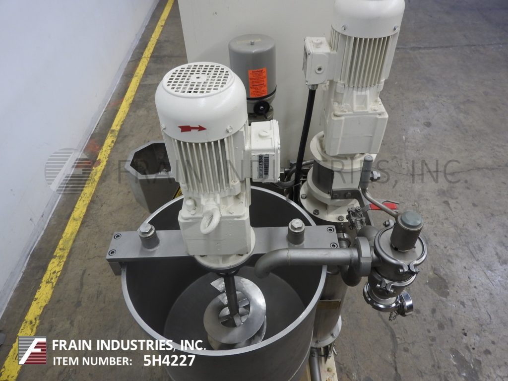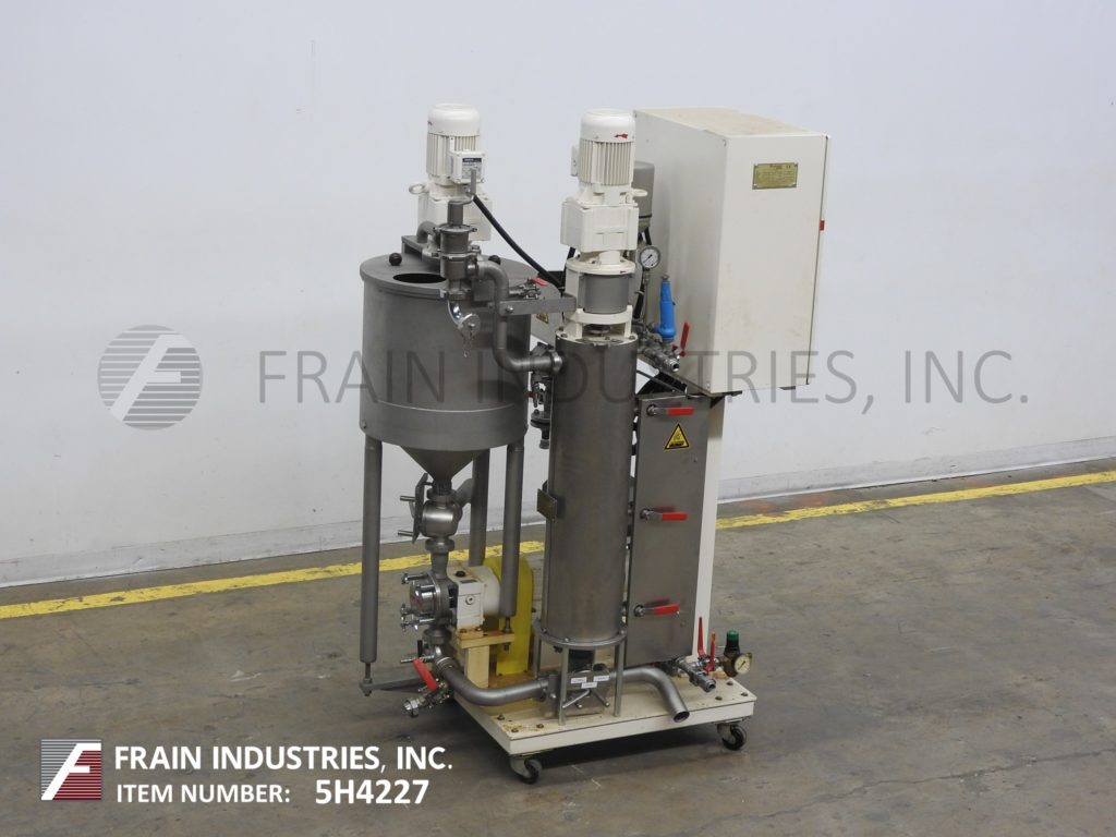 Klockner Hansel, Model HSF, skid mounted mixing and cooking system. Equipped with 20" diameter x 16" deep stainless steel single wall mixing tank has sprial agitation and powered by ¾ Hp motor drive, with Fristam, Model FKFNSH 25, PD pump powered by 1Hp drive and scrape surface heat exchanger with 4½ gallon capacity powered by ½ Hp drive. Control panel with push button start / stop and digital temperature controller.