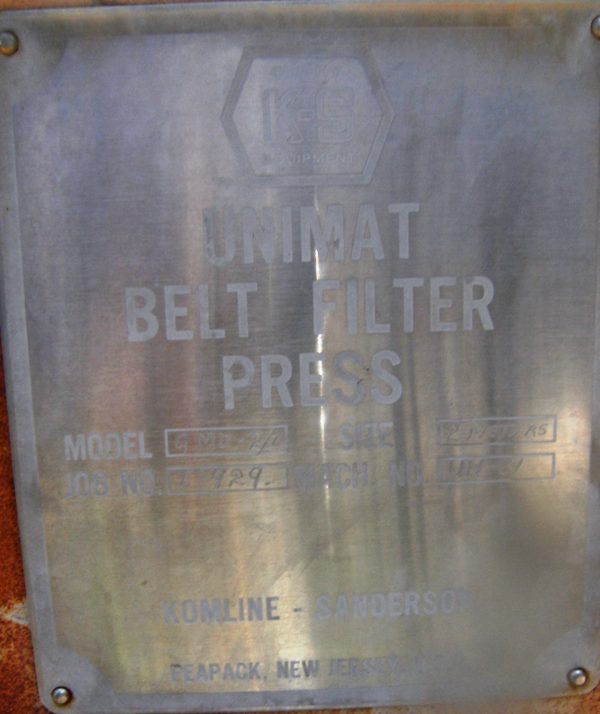 Komline Sanderson Unimat belt filter press, model GMD-2/0. This unit is a complete, 2 meter wide, stainless steel product contact part belt press. Unit features pneumatically controlled belt tracking device. Press features 1 HP, DC feeder belt drive and 2 HP, DC main press belt drive for vari-speed control. Unit is complete with some spare rolls and replacement belt. Press is in good condition, although it will require some clean-up.