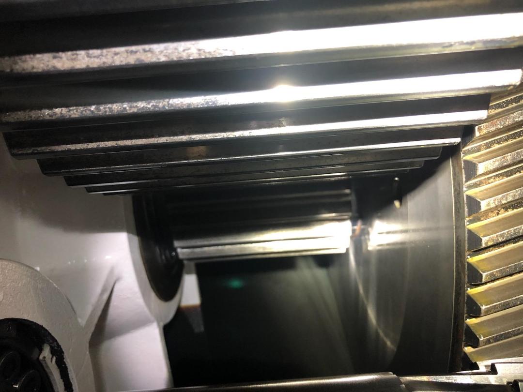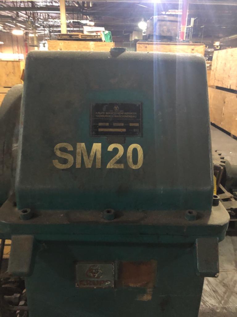 One (1) Used Krupp 6" 150mm Cold Feed Rubber Extruder, 18:1 L/D ratio, belt driven motor, external gearbox lube pump with filter, gearbox in excellent condition, PFR power feed roll, adjustable scraper blade, forced gearbox lubrication